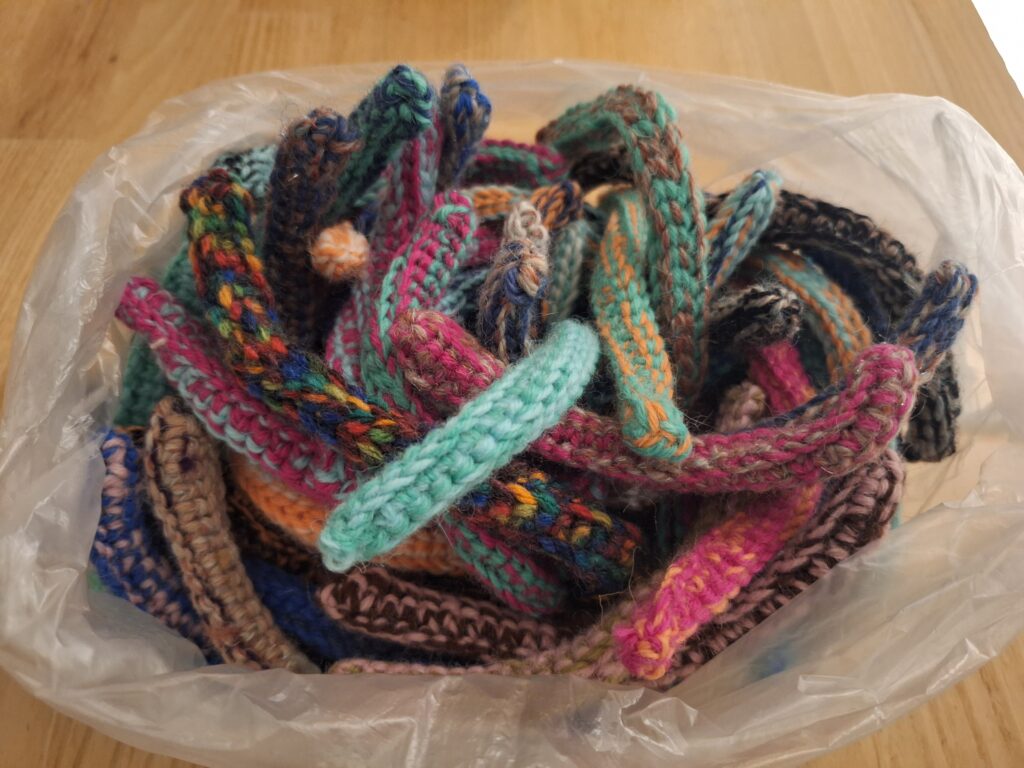 Supersuosittuja virkattuja ”pötkylöitä”, joita kissat rakastavat. Materiaali villasekoitelanka.