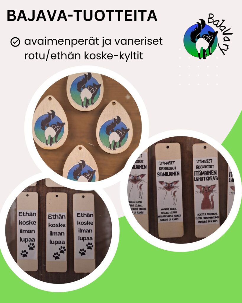 Tervetuloa BaJaVan kauppaan! Täältä voit tilata kissoihin liittyviä tuotteita sähköpostitse tai ostaa niitä yhdistyksen tapahtumista. Tuotto käytetään yhdistyksen toiminnan tukemiseen.